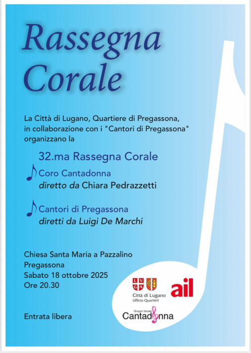 Sabato 18 ottobre ore 20:30 Chiesa di Santa Maria a Pregassona rassegna corale con i Cantori di Pregassona diretti dal maestro Luigi De Marchi